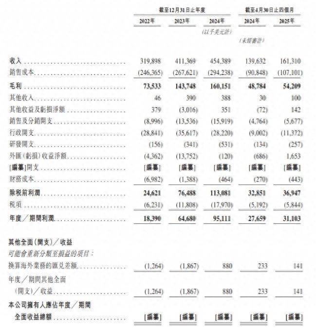 不外,尽工作迹亮眼,但财报中也揭示了几个阻截冷落的风险点。其一,外汇风险的广宽波动性。公司2023年碰到了1375万好意思元的多量外汇净赔本,2022年也有436万好意思元的损失。天然2024年和2025年前四个月情况好转(以至产生收益),但这充分闪现了其在多个新兴阛阓运营所濒临的货币波动风险。正如招股书所指示,其收入(土产货货币)与老本(好意思元、东谈主民币)的货币错配,可能导致翌日再次出现紧要汇兑损失。其二, 2025年前四个月的潜在压力。天然收入和利润完全值仍在增长,但一些比率见识炫夸短期承压。比如毛利率从客岁同期的34.9%降至33.6%;净利率从客岁同期的19.8%降至19.3%,标明阛阓竞争加重的影响仍是初始响应到举座盈利智商上。